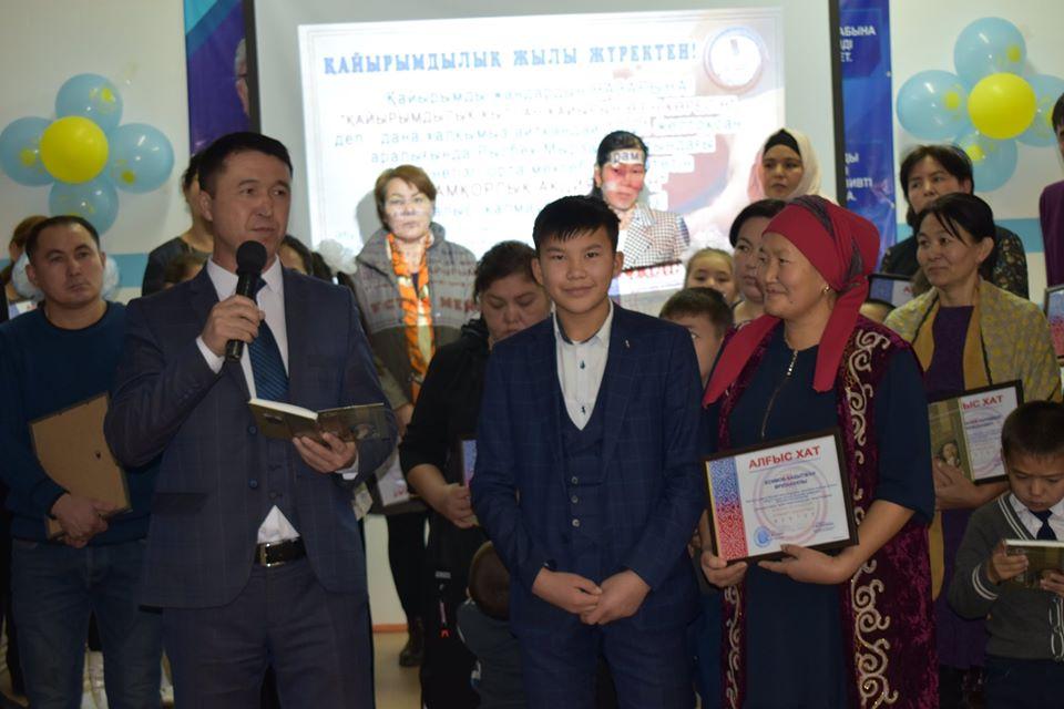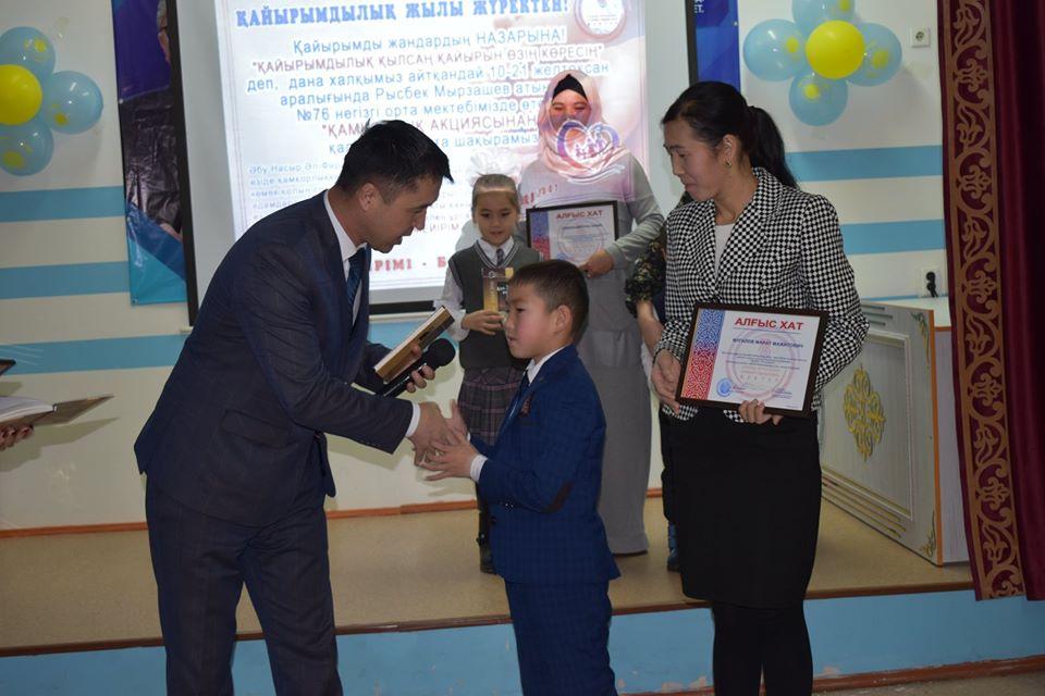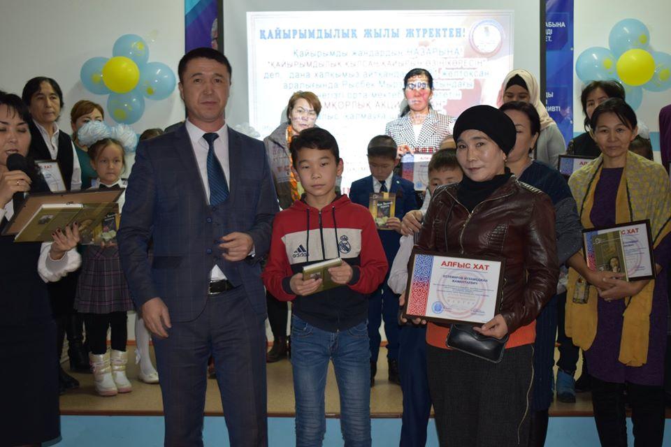 «ҚАЙЫРЫМДЫЛЫҚ ЖЫЛЫ ЖҮРЕКТЕН» атты қайырымдылық акциясы балалардың санасына мейірімділік, қайырымдылық ұғымдарын қалыптастыра отырып, оқушыларды кішіпейілдікке, бауырмалдыққа баулу. Ізгі қайырымды істер жасау арқылы балалардың Ризашылығы мен алғыстарын ала отырып, үлкен - кішіге деген сүйіспеншілігін, сыпайылық қарым - қатынасын дамытуға бағытталған. Осыған орай мектеп директоры А.Ж.Тажен мектебіміздегі оқу озаттарының және мектеп белсенділерінің ата-аналарына, балаға отбасында берген саналы тәрбиесі үшін алғыс білдіріп, оқушыларға ең қымбат асыл қазынасы - кітап сыйлады. Мектебіміздің президенті, озат оқушы және жас ақынымыз 9 «А» сыныбының оқушысы Әріпхан Нұрдаулетке мектеп директоры ерекше ықылас білдірді. Нұрдаулетке ұстаздарымен ата-анасының үмітін ақтайтын, келешегінен зор үміт күттіретін азамат болатынына сенім білдірді, және де ата-анасына алғыс айтты.