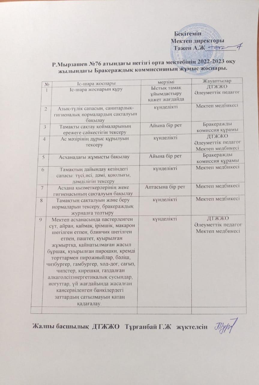 Р.Мырзашев атындағы №76 негізгі орта мектебінің 2021-2022 оқу жылындағы Бракераждық комиссияның жұмыс жоспары