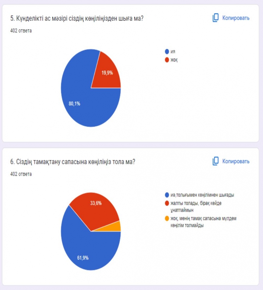 Р.Мырзашев атындағы №76 негізгі орта мектебінің 5-9 сыныптар арасында мектеп асханасы туралы сауалнама алынды.