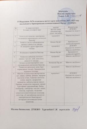 2022-2023 оқу жылындағы Бракераждық комиссияның жұмыс жоспар » «№76 Рысбек Мырзашев атындағы негiзгi орта мектеп» КММ